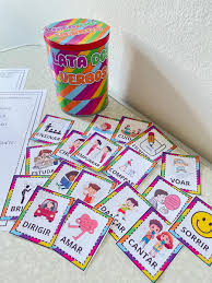 👉 Dentro da lata, a criança encontra cartinhas coloridas e dinâmicas, com diferentes tempos verbais, que podem ser usadas em jogos, sorteios e atividades em grupo.